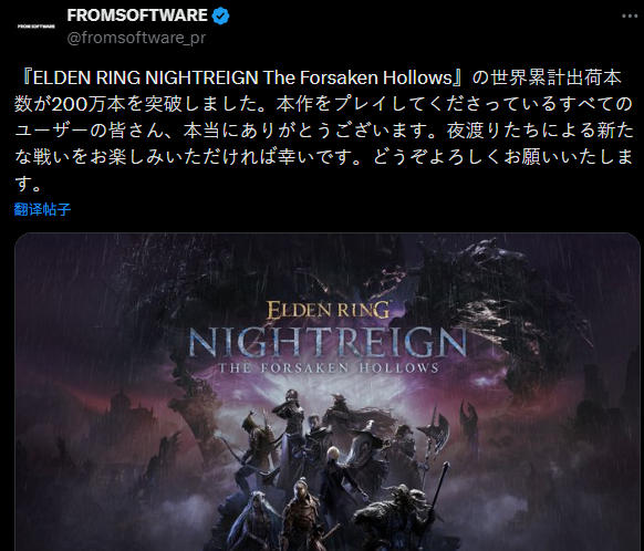 《艾尔登法环:黑夜君临》首款DLC销量突破200万