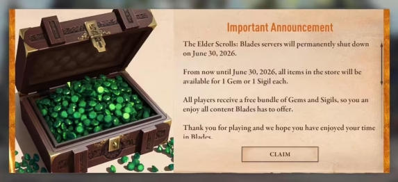 贝塞斯达宣布,旗下免费游戏《上古卷轴:刀锋》将于今年6月正式停运,该游戏目前已从Switch、iOS和Android平台全线下架,无法再下载游玩。官方确认,游戏将于2026年6月30日关服,届时玩家将彻底无法登录。