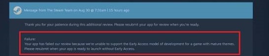 Steam在发送给部分开发NSFW游戏工作室的通知中写道:“您的应用未能通过审核,因为我们无法支持一款包含成人向主题的游戏以抢先体验模式进行开发。”这一变动反映出平台审核政策进一步收紧,部分敏感内容游戏将无法再以EA形式发布。