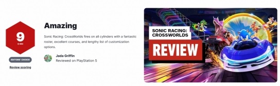 《索尼克赛车:交叉世界(Sonic Racing: CrossWorlds)》媒体评测已正式解禁,IGN为本作打出了9分的高分成绩。