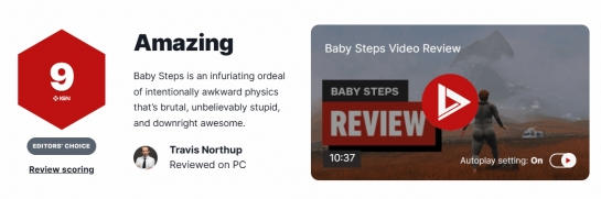 IGN简评:《一步一脚印》是一款令人抓狂的游戏,它故意设计出笨拙的物理效果,既残酷又愚蠢得令人难以置信,但却相当酷。