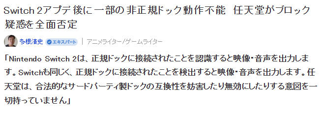 针对质疑,任天堂的宣传部正式回应,Switch2与一代主机一样,都支持正规底座的接驳功能,任天堂完全没有任何刻意排斥合法第三方底座的使用的设计。
