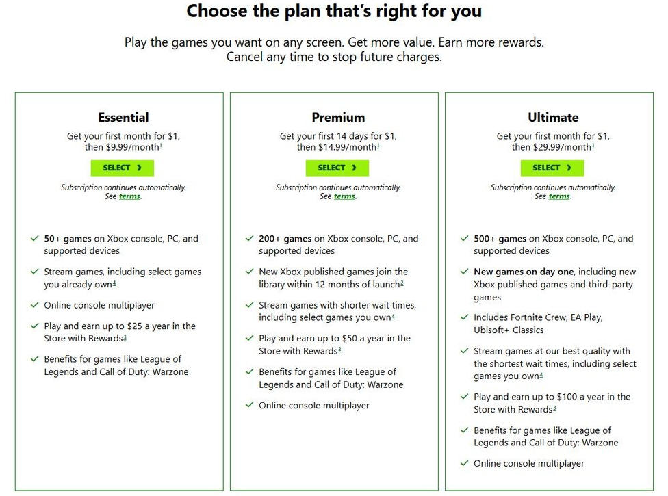 据用户Wario64的发现,在Xbox Game Pass的加入页面上明确显示,新用户当下能够以1美元的价格,获取Ultimate或者Essential档位的首月订阅服务,首月过后就会恢复正常的扣费标准。