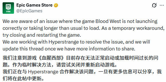 对此,Epic Games Store官方已通过社交媒体发布公告,确认了该游戏在平台上出现的启动与加载bug,并同步了临时解决措施及后续安排: