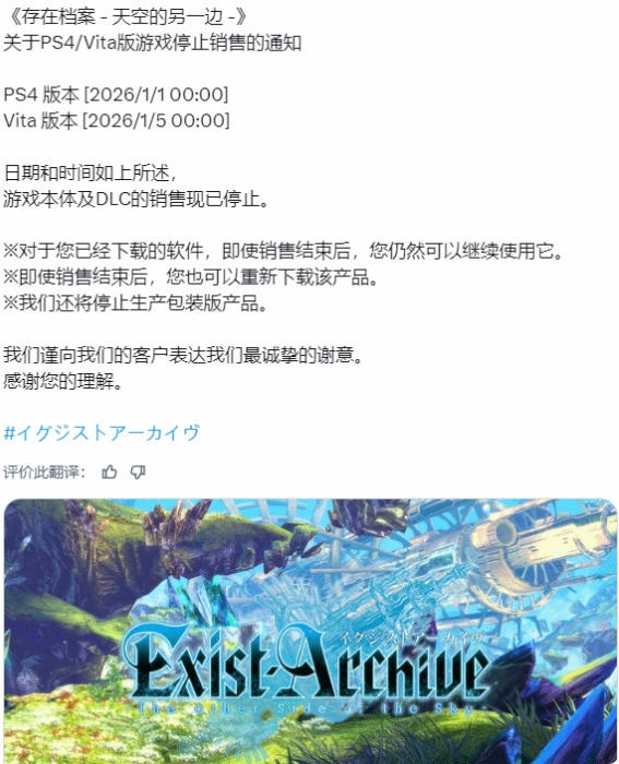 目前停售通知仅在日本发布,但此举引发了海外玩家对游戏在欧美等其他地区下架的担忧。当前英文版在日区以外的PS商店仍可购买,开发商Spike Chunsoft尚未说明英文版是否同步下架。