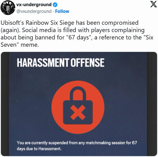 根据社交媒体用户vx-underground的爆料以及大量玩家社区的反馈,《彩虹六号:围攻》的服务器已遭到入侵。许多玩家登录游戏时发现自己的账号因“骚扰违规”而被处以67天的封禁,而他们并未违反任何社区准则。这个特定时长——“67”已成为网络流行文化中的一个常见梗(源于一段视频,代表了一种无意义但有趣的社交互动),因此被广泛视为服务器被黑客控制的明确信号。