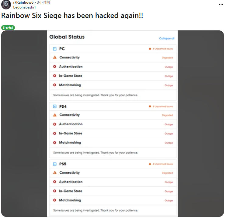 这已是《彩虹六号:围攻》近期第二次重大安全事故。首次危机爆发于12月27日,黑客当时向玩家发放20亿游戏币,并篡改游戏日志嘲讽育碧员工及CEO伊夫·吉耶莫。同次入侵中还发生数千玩家账户遭无故封禁又解封的混乱情况。育碧虽最终通过冻结服务器尝试修复,但影响已难挽回。