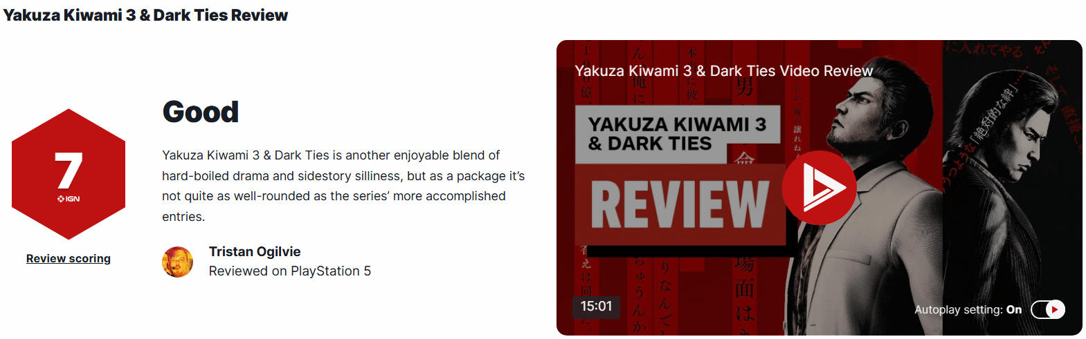 IGN简评:《如龙:极3/如龙3外传Dark Ties》依然是硬派剧情与支线趣味的精彩融合,但作为一个整体,它不如该系列中那些更出色的作品那样全面。