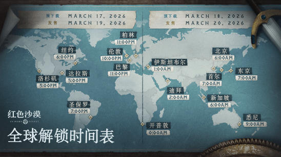 Pearl Abyss正式公布了《红色沙漠》的全球解锁与预载时间。国区(北京)解锁时间为3月20日早上6:00。预购玩家可提前48小时下载游戏,国区预载开启时间为3月18日(周三)早上6:00。